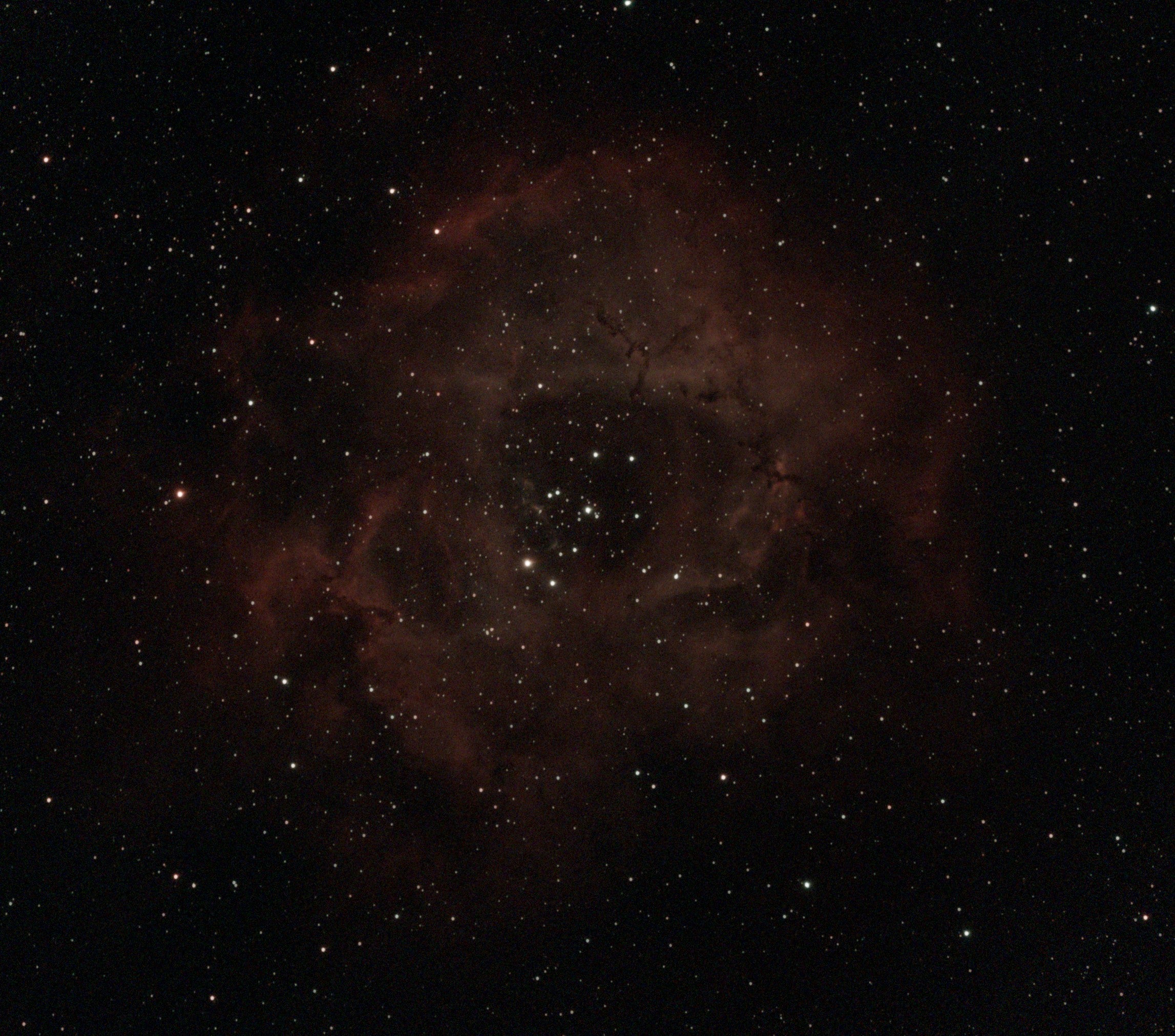NGC2237 ばら星雲は、まさに宇宙に咲く真っ赤なバラの花のような美しい星雲ですが、残念ながら肉眼では見えません。光害のある大阪市内からVesperaでばら星雲の撮影に挑戦しました。なお、ばら星雲は大きな星雲であるため、モザイクモードでばら星雲全景を撮影しています。 1. まずは光害カット(CLS)フィルターを装着して撮影Vesperaモザイクモード撮影時間:120分Vespera光害カット(CLS)フィルター使用JPEG撮って出し Vespera光害カット(CLS)フィルターを装着した状態では、120分の撮影でも赤い星雲の姿がうっすらとしか現れていません。CLSフィルターで大きな効果がでる天体も多いのですが、ばら星雲ではもっと強