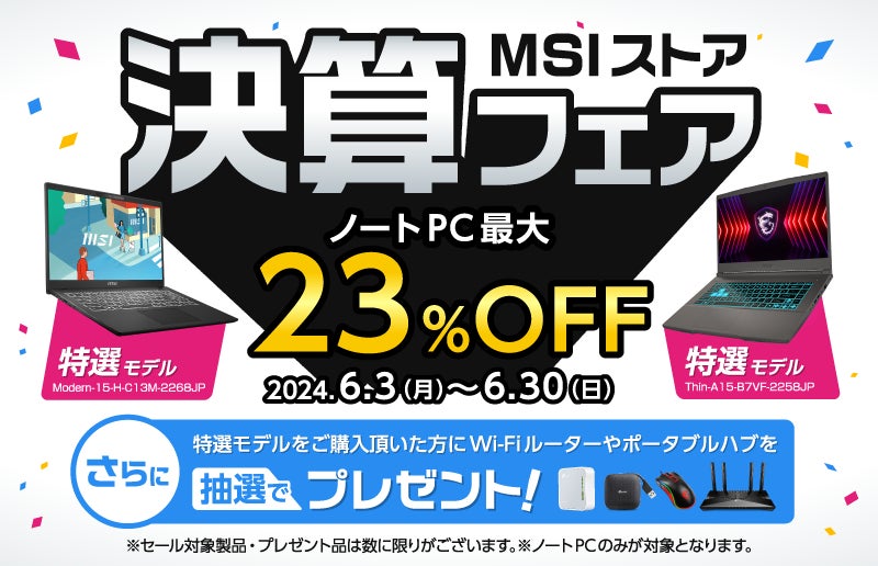 2024年6月3日 MSI公式オンラインショップ『MSIストア 決算フェア』 最新モデルを含む対象ノートPCが最大23%OFF! 抽選で合計80名様にWi-Fi ルーターなど便利なアイテムをプレゼント!!