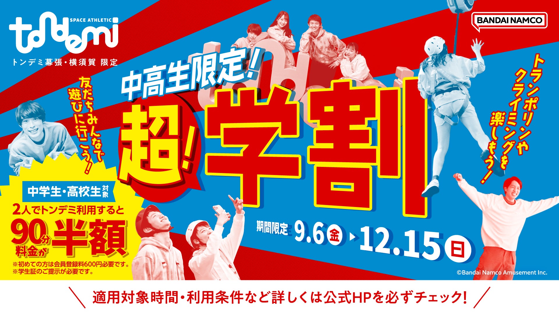 2024年9月5日 中高生限定!2人以上で半額になる「超!学割」 トンデミ幕張・横須賀にて 9月6日(金)より開始!