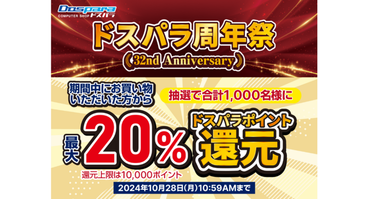 2024年10月11日 【ドスパラ】ご愛顧いただき32周年『ドスパラ周年祭』開催 期間中の購入合計金額20%(最大1万円)分のドスパラポイントが抽選で当たる